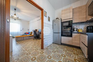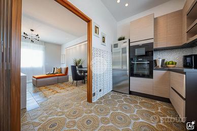 Ingresso su ampia sala con cucina moderna separata e affaccio diretto sul balcone.