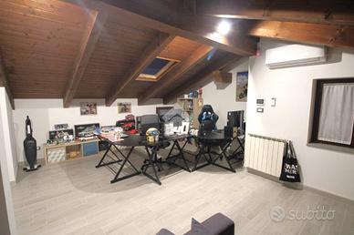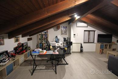 Il piano mansardato ospita un ampio locale open space con travi a vista, uno spazio caldo e suggestivo che si presta a molteplici utilizzi: zona relax, studio, palestra o area hobby, facilmente adattabile alle diverse esigenze della famiglia.