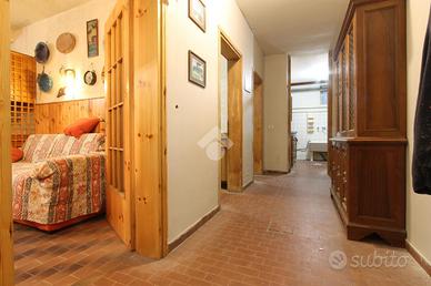 L'abitazione si apre su un ingresso che distribuisce i locali tra zona giorno, zona notte e uno studio, eventualmente utilizzabile come quarta camera. La zona giorno si compone di un soggiorno doppio con caminetto, sala da pranzo e cucinino separato, entrambi con accesso alle terrazze. La zona notte ospita due camere matrimoniali, una camera singola di circa 11 mq e due bagni finestrati.