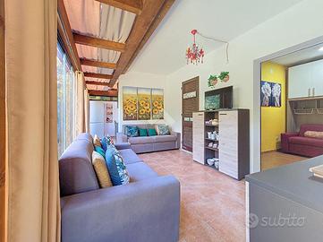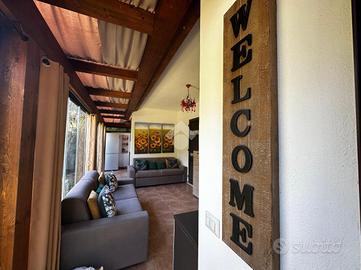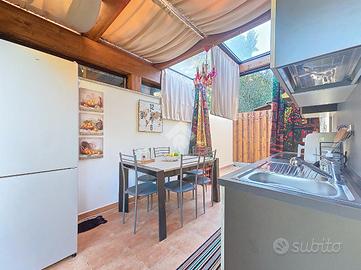 L'ingresso che ci accoglie a questa esclusiva porzione di bifamiliare, è valorizzato dalla presenza del verde lungo tutto il passaggio al giardino di esclusiva proprietà, accediamo alla casa tramite porta finestra che grazie alla presenza di vetrate scorrevoli è stato ricavato uno spazio accogliente vivibile anche nella stagione invernale.