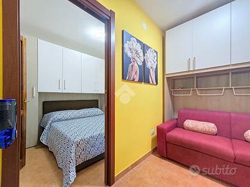 Tramite portone blindato accediamo alla zona notte, davanti un comodo divano letto, sulla nostra sinistra la camera matrimoniale e sulla destra disimpegno, bagno ampio e funzionale e per finire una cameretta con angolo studio.