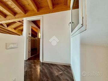 Il livello superiore : una mansarda con travi a vista. Spazio jolly che si adatta a mille usi grazie alla sua ampia metratura e all'ulteriore bagno completo di doccia.