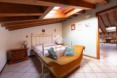 Villafranca di Verona - posizionate in zona centrale, comode al raggiungimento del centro ed i suoi servizi comodamente a piedi, proponiamo in vendita due abitazioni, un' ampia villa a schiera angolare disposta su tre livelli fuori terra ed un appartamento disposto su due livelli attualmente al grezzo. SOLUZIONE 1 - Villa a schiera, dotata di ingresso indipendente, al piano rialzato si compone di soggiorno di 16.00 mq, separato dalla cucina abitabile di 15.00 mq, entrambi i locali sono serviti da balcone e dal bagno finestrato. Salendo l'elegante scala arriviamo al reparto notte, dove attualmente troviamo la camera da letto matrimoniale di 16.30 mq, la camera da letto doppia di 12.50 mq ed ulteriore bagno finestrato. All'ultimo piano dell'abitazione, caratterizzata da alto e caldo travato a vista troviamo la soffitta, dove poter ricavare ulteriori due camere da letto, di cui una matrimoniale di 21.70 mq ed una doppia di 12.70 mq, il tutto servito da pratico balcone. Al piano terra, tramite il giardino angolare è possibile raggiungere la taverna di 30.00 mq dotata di camino a legna, ulteriore stanza di 16.00 mq adibita a studio, bagno finestrato e cantina di 25.00 mq. SOLUZIONE 2 - Al piano primo, appartamento disposto su due livelli completamente al grezzo che si sviluppa per un totale di 190.00 mq, potendo così ricavare due piani da 95.00 mq ciascuno. Soluzione unica nel suo genere, viste le generose metrature, le due unità abitative e la posizione centrale e strategica.