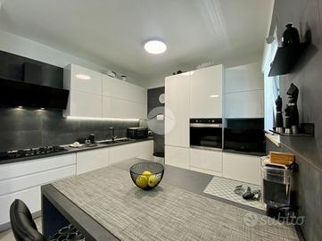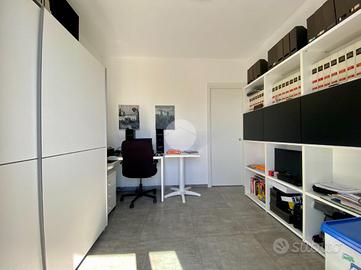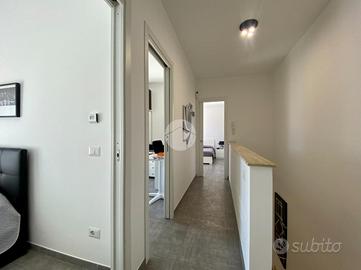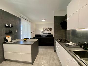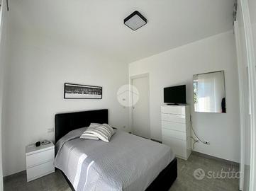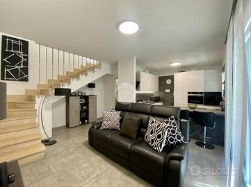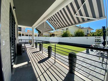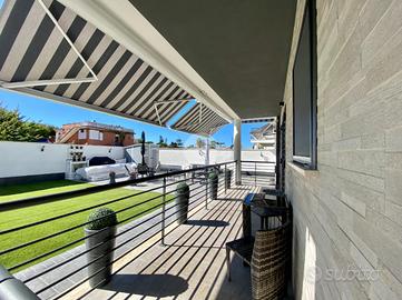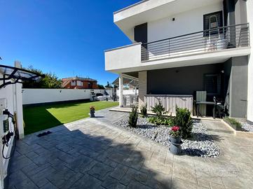 La casa è circondata da un giardino privato di circa 200 mq, in parte pavimentato con cemento stampato e in parte rifinito con prato sintetico, perfetto per trascorrere momenti di relax all'aperto. Gli spazi esterni sono già attrezzati con arredi da giardino, verande, mobili da esterno e tende da sole Tempotest, offrendo un ambiente ideale per vivere l'esterno in ogni stagione.