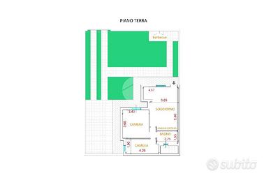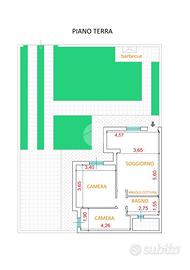 Porzione di quadrifamiliare di 70 mq al piano terra composto da soggiorno con angolo cottura, disimpegno, 2 camere e bagno. Giardino di 130 mq con ingresso carrabile.