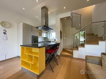 Al piano inferiore la zona giorno open-space, una camera da letto matrimoniale ed il bagno finestrato ; da questo piano si accede alla proprietà esterna dove si trova un ampio porticato ed il resede-giardino per un totale di circa 150 mq.