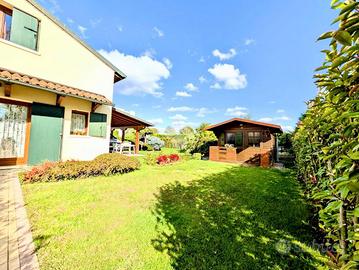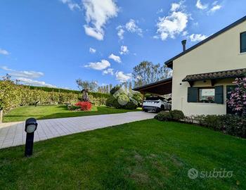 A completamento del tutto, la casa offre una pompeiana esterna che può ospitare comodamente un'auto e un garage doppio di ben 36 mq. al piano interrato.