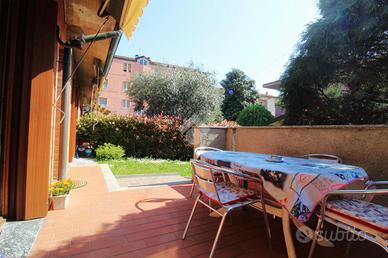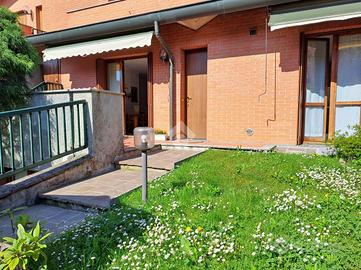 L'ingresso alla proprietà avviene attraverso un cancelletto pedonale che conduce al giardino che offre un angolo di verde riservato, ben curato e arricchito da un patio coperto, ideale per trascorrere piacevoli serate estive.