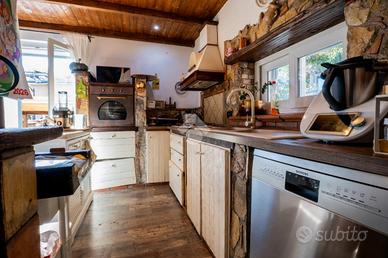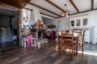 L'ingresso si apre su un accogliente soggiorno con angolo cottura e camino in stile rustico, caratterizzato da travi a vista e finiture calde. Una camera da letto matrimoniale, un bagno finestrato con box doccia e un pratico ripostiglio completano il piano. Il soggiorno è impreziosito da due porte finestra che garantiscono luminosità naturale e consentono l'accesso diretto allo spazio esterno di pertinenza, completamente pavimentato, perfetto per momenti di relax e convivialità, dotato di forno a legna e barbecue in muratura.