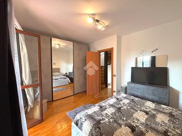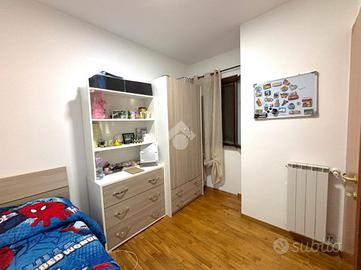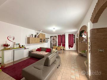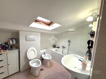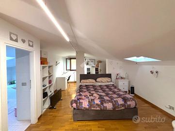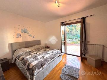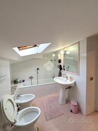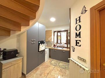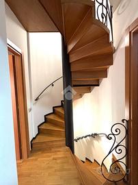 Il primo appartamento è disposto su più livelli. Al piano terra: salone con camino termo-ventilato, cucinotto a vista e bagno di servizio finestrato; al primo piano, la zona notte: disimpegno, camera da letto matrimoniale con accesso ad un terrazzo di circa 30 mq, cameretta e bagno finestrato con doccia; all'ultimo piano, la mansarda, composta da camera da letto con ripostiglio/cabina armadio, bagno finestrato con vasca ed un secondo ripostiglio. All'esterno un bel portico di 70 mq e il giardino circostante di circa 370 mq.