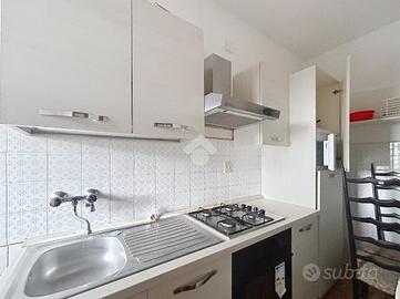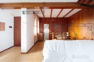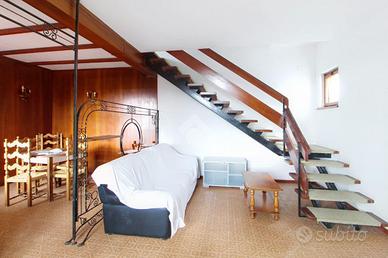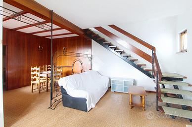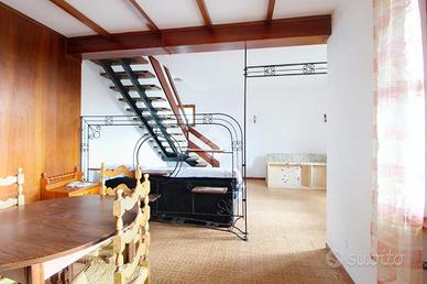 L'interno si apre su una luminosa zona giorno open space, composta da soggiorno, area pranzo e cucinotto con scala a vista che collega il piano superiore.