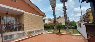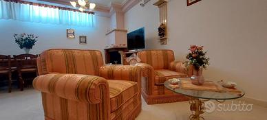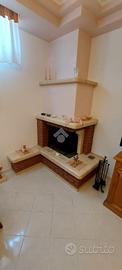 Piano interrato: ampio soggiorno con camino, cucina su misura con bancone all'americana, cucinotto, terzo bagno e ingresso indipendente dal giardino.