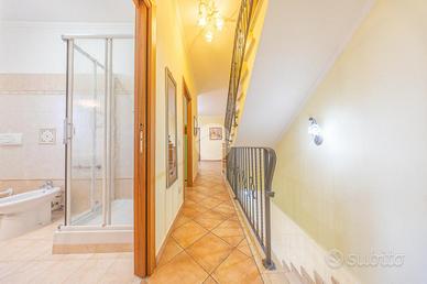 Salendo al piano superiore, troviamo un suggestivo ambiente mansardato abitabile con travi in legno a vista, attualmente adibito a salone con terrazzino riservato, e un bagno finestrato completo di doccia.