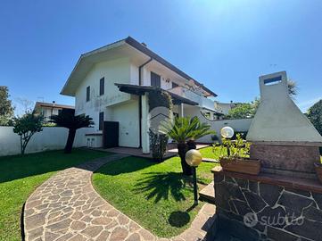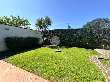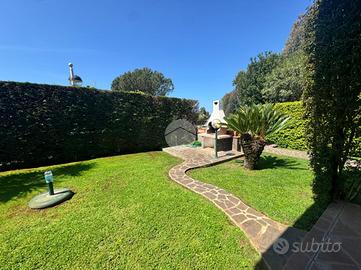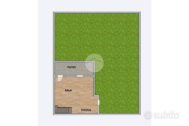 Entrando nella proprietà troviamo il giardino dotato di impianto d'irrigazione automatica, doccia esterna mattonata, e il patio con tettoia in legno.