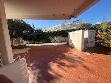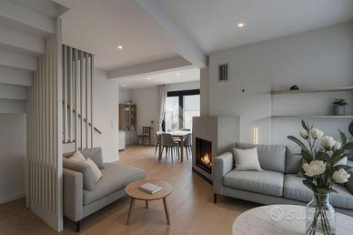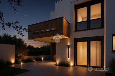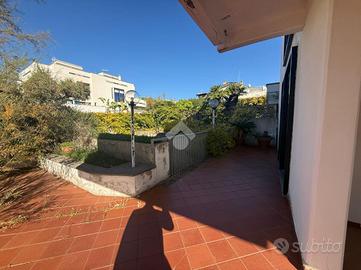 Il piano terra è dedicato interamente alla zona giorno, composta da doppio salone con camino e due splendide vetrate che affacciano sull'ampio giardino di circa 150 mq, pavimentato arricchito da zona relax, doccia esterna e zona barbecue, successivamente è presente la cucina separata con accesso ad un piccolo spazio esterno comodo come ripostiglio esterno ed infine il bagno finestrato di servizio.