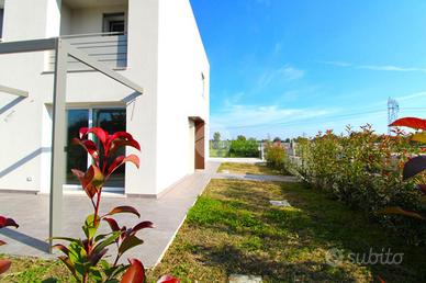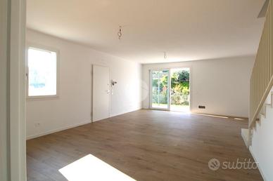 L'abitazione si distingue per il suo design moderno e funzionale, offrendo ambienti luminosi che favoriscono un'atmosfera accogliente. La disposizione degli spazi interni è ben studiata: al piano terra troviamo un soggiorno con cucina a vista, dal quale è possibile uscire direttamente nel giardino esclusivo, perfetto per momenti di relax o cene all'aperto durante la bella stagione. A servizio del piano troviamo il primo bagno finestrato e poi il garage con accesso direttamente alla casa.