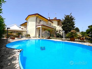 Il giardino di circa 230 mq dove troviamo la piscina, con area attrezzata con barbeque e forno esterno, spazio che ci permette di godervi piacevoli pranzi e cene all'aria aperta. Inoltre abbiamo la possibilità di parcheggiare l'auto all'interno della proprietà sotto un tendendone.