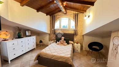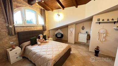 Piano Superiore: disimpegno con accesso al balcone, camera matrimoniale con caratteristici soffitti in legno con travi a vista, camera singola attualmente adibita a cabina armadio e bagno;