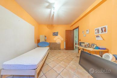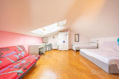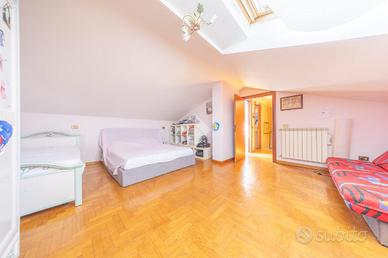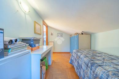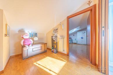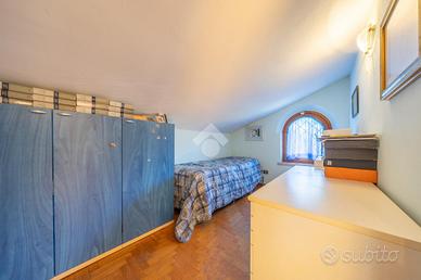La scala interna conduce al piano superiore, dove si sviluppa la zona notte: una camera matrimoniale ampia e luminosa, una camera singola, un bagno finestrato e un grande ripostiglio, ideale come cabina armadio o vano guardaroba.