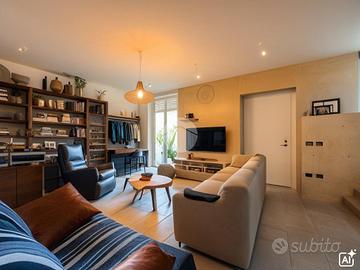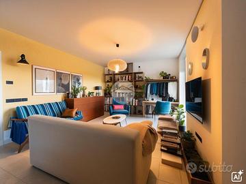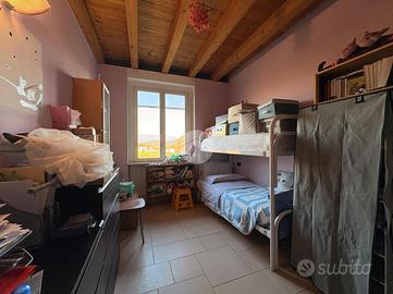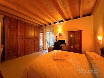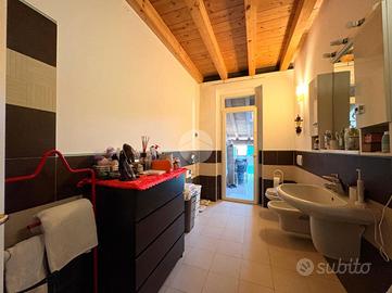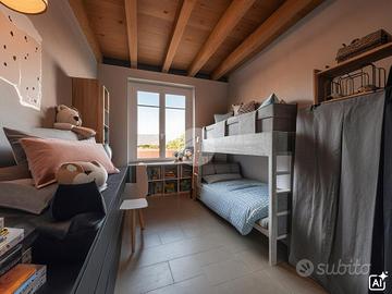 Salendo ai piani superiori, troviamo la zona notte adornata da travi a vista, dove sono presenti tre camere da letto, di cui due singole ed una matrimoniale con sfogo diretto su un importante loggia illuminata da lucernari a soffitto.