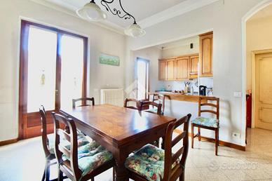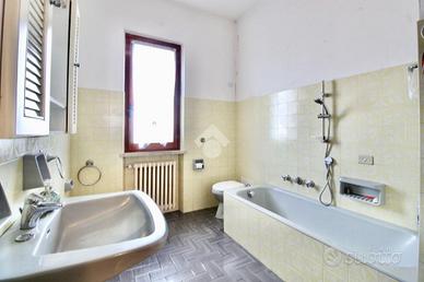 Dalla sala da pranzo si accede direttamente al resede tergale pavimentato di ulteriori 95 mq, perfetto per pranzi o cene all'aperto.