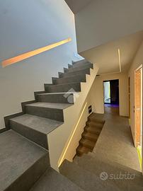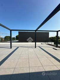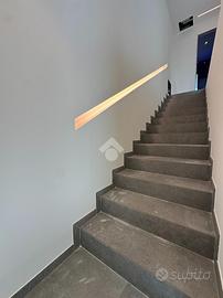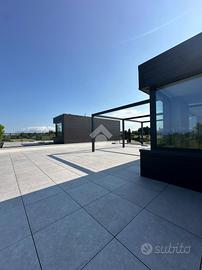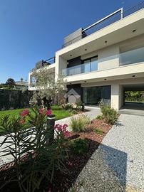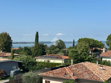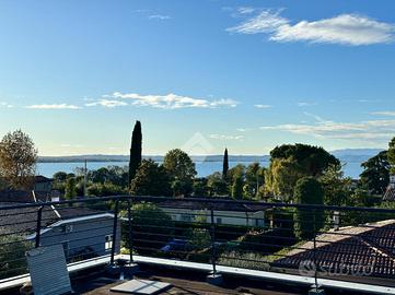 Il giardino privato di 200 mq, completamente piantumato, e l'ampio porticato di oltre 80 mq assicurano un comodo sfogo esterno per godere al massimo la bella stagione; al piano terra si trova la zona giorno con angolo cottura e con le grandi vetrate che garantiscono un'ottima luminosità; allo stesso piano è presente anche un primo bagno finestrato con doccia. Salendo le scale, al piano primo, trovano spazio due camere matrimoniali e il bagno principale con piatto doccia da 2 metri; uscendo da entrambe le camere si accede alla terrazza esterna di oltre 90 mq, in parte aperta e in parte coperta (già predisposta per una chiusura con vetrate panoramiche). Salendo al secondo piano si accede alla terrazza solarium di oltre 130 mq con vista lago, pergola chiudibile e attacchi per eventuale vasca jacuzzi.