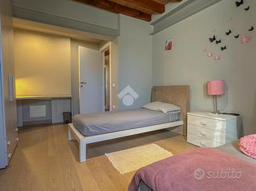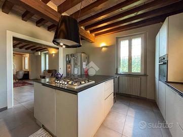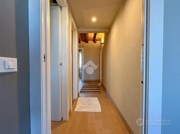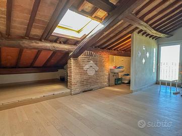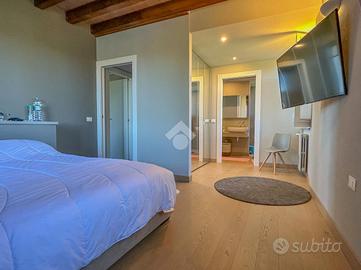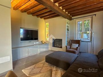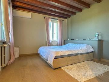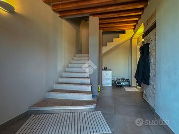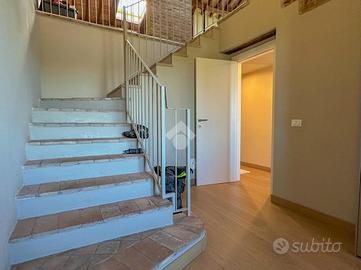 Una scala interna in muratura, caratterizzata da eleganti finiture rustiche, conduce al piano superiore, dove troviamo un ampio disimpegno arredabile, tre camere matrimoniali -- di cui una dotata di cabina armadio e bagno privato -- e un ulteriore bagno a servizio del piano.