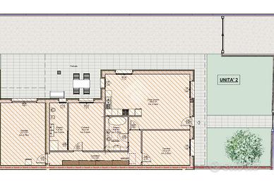 Gli spazi interni sono progettati per garantire funzionalità e comfort, con un'ampia zona giorno che si apre su un giardino privato, ideale per momenti di relax all'aperto, e su un portico coperto con accesso dalla cucina.