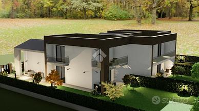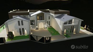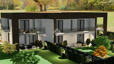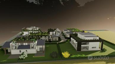 LA CASA CHE HAI SEMPRE SOGNATO COSTRUZIONE A 5 STELLE - LA CASA CHE RESPIRA NZEB Il nuovo complesso residenziale 'Luxury Resort Le Ville Green' sorgerà nella zona Sud del paese, alle spalle del centro storico e prevede la realizzazione di 18 unità abitative, 13 delle quali con accessi pedonali e carrabili indipendenti e ampi giardini di pertinenza. Nello specifico verranno edificate una villa singola, due bifamiliari, una trifamiliare e due piccoli condomini da 5 unità cadauno indipendenti. La villetta qui proposta fa parte di un lotto trifamiliare con giardino posto ad est e ad ovest del fabbricato. Al piano terra si trova l'ampia zona giorno, il bagno, la lavanderia, due porticati importanti e l'accesso diretto all'autorimessa doppia in larghezza oltre al posto auto coperto da pergolato in legno; al piano primo troviamo le tre camere matrimoniali, il bagno e un'ampia terrazza. Soluzioni di varie tipologie e metrature - Ville su due livelli - Appartamenti indipendenti con giardini privati - Appartamenti con ascensore direttamente in casa - Attici con grandi vetrate e terrazzi con giardini a pensili. La parola d'ordine di questo progetto è 'GREEN ', verrà infatti realizzato con una particolare attenzione al contenimento dei consumi energetici così da classificarsi in Classe ' A4 ' a bolletta zero, in quanto l'energia necessaria per la vostra abitazione sarà garantita da fonti rinnovabili con pompa di calore collegata al fotovoltaico con accumulo. Inoltre sono dotate di un sistema di VMC (ventilazione meccanica) per la sanificazione degli ambienti e la deumidificazione. Questo contesto sembra essere nato già nel FUTURO, ogni particolare sia costruttivo che di finiture è stato prima studiato e pensato, poi scelto per una clientela esigente e sensibile al benessere unico, viziata e coccolata all'efficenza e all'ambiente. Gli elevati standard che s'impone questo progetto hanno portato l'esecutore a scegliere tecnologie costruttive altamente perf