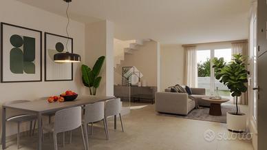 Nello specifico proponiamo una villetta su due livelli: al piano terra una spaziosa zona giorno open space di quasi 40 mq, luminosa e con accesso diretto al portico e al giardino privato. Sempre al piano terra troveranno spazio un primo bagno completo con antibagno, una cantina, un garage ed un posto auto privato.