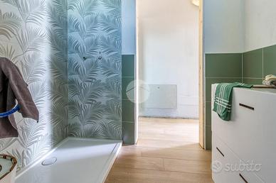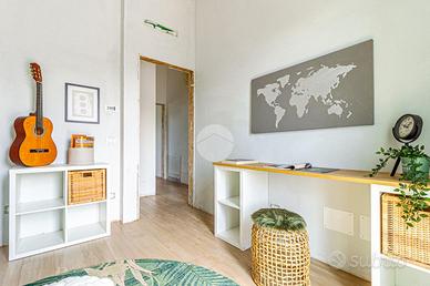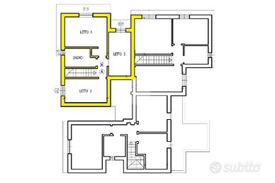 SOLUZIONE A: ingresso indipendente su giardino di proprietà in parte pavimentato di 133mq, soggiorno con cucina a vista, ripostiglio, bagno ed accesso interno all'autorimessa; tramite scala interna si raggiunge il primo piano con le tre camere da letto (una matrimoniale e due singole), bagno e balcone.
