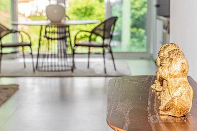 Al piano terra troviamo la sala con angolo cottura che affaccia sul giardino privato di 133 mq, bagno, ripostiglio e comodo accesso al garage.