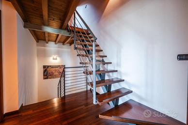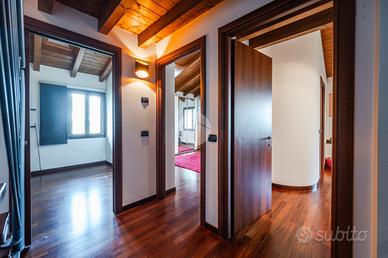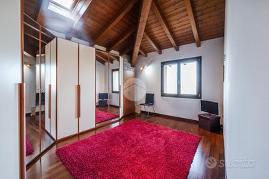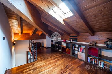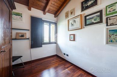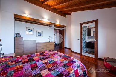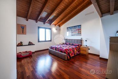 La zona notte è caratterizzata da eleganti travi in legno a vista, che conferiscono calore e stile agli spazi.