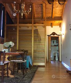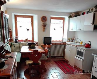Vendo porzione centrale di tri-familiare indipendente con finiture lignee di pregio e parzialmente arredata. La casa, con impianto di riscaldamento e due caminetti, è disposta su tre piani ed è stata completamente ristrutturata agli inizi degli anni 2000. Piano terra (12mq): magazzino/legnaia/lavanderia. Primo piano (29mq): atrio, bagno con doccia idro-massaggio, cucina con vista panoramica, trio CANDY, caminetto idro ad angolo, cucina economica, tavolo angolare da sei posti. Secondo piano (29mq): camera matrimoniale con poggiolo, salotto con divano letto matrimoniale, libreria a giorno. Dal secondo piano si accede ad uno scoperto (in porfido con una piccola zona verde) e alla mansarda che presenta entrata indipendente. La mansarda, con riscaldamento e luce autonomi indipendente dal resto dell'immobile, è di 29mq e composta da cucina-salotto, bagno finestrato con vasca idro-massaggio, soppalco letto, caminetto ventilato ad angolo.