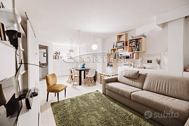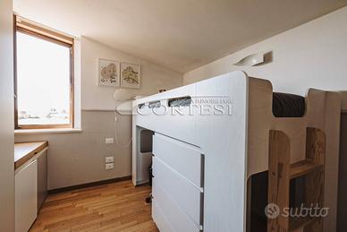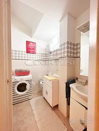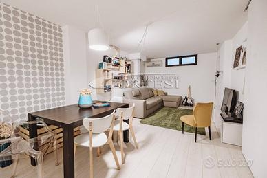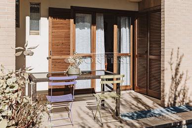 Al Piano Terra troviamo l'ingresso su una luminosa zona living, un bagno e la cucina, entrambe con accesso diretto al portico ed al giardino privato di circa 40 mq, completo di sistema di irrigazione automatico e illuminazione esterna.