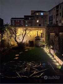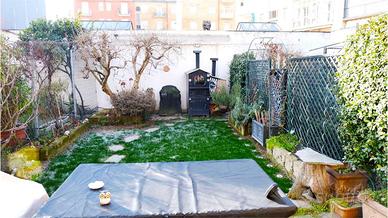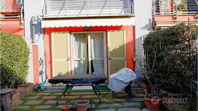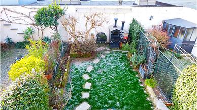Laccesso è indipendente, direttamente da portoncino privato. Entrando si percepisce subito il taglio razionale e accogliente degli spazi: al piano rialzato troviamo lingresso, una cucina abitabile in muratura realizzata su misura, un ampio e luminoso salone e il bagno. Dal salone si esce direttamente nel giardino privato, uno spazio davvero piacevole e sfruttabile, attrezzato per vivere lesterno comodamente (essendo stata installata una tenda motorizzata), con zona pranzo pavimentata in pietra di Luserna, prato, irrigazione e una splendida pianta di melograno.