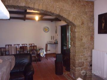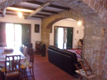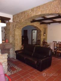 Scopri questa magnifica villa di 309 mq catastali, immersa in un terreno recintato di ben 4.950 mq, dove la tranquillità e la bellezza della natura si fondono in un'unica esperienza. Sviluppata su tre livelli, questa proprietà offre spazi ampi e luminosi, perfetti per vivere momenti indimenticabili con la famiglia e gli amici. Al livello intermedio, l'ingresso accoglie con una cucina funzionale e un bagno, mentre un ampio soggiorno con camino invita a rilassarsi. Due balconi conducono a una terrazza panoramica, ideale per pranzi all'aperto con vista mozzafiato. La tavernetta al livello inferiore, caratterizzata da un affascinante arco in pietra e un secondo camino, è perfetta per serate conviviali. Completano la proprietà una cucina attrezzata e un bagno al piano inferiore, oltre a un garage incluso. Al terzo livello sottotetto, tre camere da letto e un ulteriore bagno offrono il massimo del comfort.