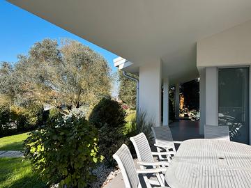 Arquà Polesine (Rovigo), a 2 minuti dal centro del paese e servizi, a 100 metri dalla fermata del servizio di trasporto extraurbano, a 3 minuti dal casello dell'autostrada e a 10 minuti da Amazon. E' stata interamente efficientata nel 2022 con gli ecobonus della legge 110/2020. Il tetto è stato rifatto completamente nel 2016, con sistema di microventilazione. Si compone di 4 piani sfalsati: dalla scala interna o dal vialetto esterno si accede al primo piano, nell'elegante salone con pavimento in marmo e finiture di pregio, impreziosito dal camino a pellet (in alternativa al riscaldamento con ventilconvettori). E' presente un'ampia cucina abitabile, separata dal salone da una grande porta scorrevole; 4 ampie porte finestre garantiscono un'eccellente illuminazione naturale e uno splendido affaccio sul giardino e sull'ampio patio panoramico, ideale come zona living. Al piano superiore, a cui si accede mediante 4 scalini, si trova la zona notte con pavimento in parquet; presenta 4 camere (di cui due matrimoniali) e ampio bagno piastrellato con finiture di pregio (con doccia/sauna e vasca idromassaggio). Al piano terra un ampio ingresso (porta di design di dimensioni generose apribile in due parti), sala tecnica, sala da bagno (con doccia walkin di metri 2X1), ampio locale lavanderia e ripostiglio. Pavimentazione in gres porcellanato effetto cemento. Al piano seminterrato (raggiungibile con soli tre scalini) è presente la taverna di circa 100 mq. impreziosita da camino a pellet (in alternativa al riscaldamento con ventilconvettori), ampia sala svago finestrata, cantina, tutto pavimentato in gres porcellanato effetto cemento. La villa gode di un ampio viale illuminato, parcheggio interno, rimessa per attrezzi e ampio giardino piantumato, illuminato, dotato di impianto di irrigazione, spazio ideale per il relax e per momenti conviviali. Il vicinato è estremamente gentile.