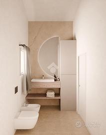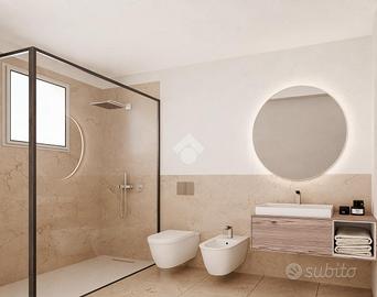 La zona notte è separata in due zone, in modo da garantire privacy e comfort. A sinistra della zona giorno troviamo la camera padronale, con il suo bagno privato con reparto lavanderia e disimpegno, per un angolo di intimità esclusivo. Proseguendo oltre la zona living, si accede alla seconda zona notte, che include due camere doppie, di cui una con possibilità di ricavare una cabina armadio, entrambe servite da un elegante bagno padronale.