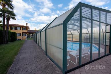 Proponiamo in vendita una raffinata porzione di villa bifamiliare situata a soli 2 km dal centro del paese. L'immobile è circondato da un ampio giardino privato di oltre 4.000mq, impreziosito da una piscina di quasi 100mq con diverse profondità e copertura telescopica, ideale per il relax e il divertimento in ogni stagione. L'abitazione che si sviluppa su tre livelli è in ottimo stato di conservazione ed è stata soggetta ad importanti interventi di restauro. Al piano terra si trova un'ampia veranda riscaldata, adibita anche a zona giorno di 53 mq, caratterizzata da grandi vetrate e soffitti con travi a vista, una zona pranzo, cucina abitabile, disimpegno, bagno di servizio finestrato e una spaziosa lavanderia/locale tecnico. Al piano superiore si sviluppa la zona notte, composta da tre camere da letto, un bagno e una terrazza. Al piano interrato sono presenti una taverna e un ulteriore locale adibito a zona relax o cinema. A pochi passi dalla piscina, nel 2024 è stata realizzata una depandance completamente indipendente dall'abitazione principale, dotata di doppio garage, magazzino, bagno e tettoia/pensilina per impianto fotovoltaico. Completano la proprietà un pratico ricovero attrezzi e un'area giochi per bambini con pavimentazione anti-trauma ed una zona ristoro con barbecue e camino.. Tra gli accessori tecnici di rilievo si segnalano pannelli fotovoltaici da 5 kWh, impianto di riscaldamento con caldaie ad alta efficienza, impianto di domotica, copertura Wi-fi su tutta la proprietà, aria condizionata in ogni stanza, due caminetti interni ed una stufa a pellet, sistemi di allarme volumetrico, perimetrale e videosorveglianza. Inoltre sono stati rifatti l'impianto elettrico ed idraulico ed installati serramenti in PVC antisfondamento nel 2015. Una soluzione unica ed esclusiva, ideale per chi desidera vivere in un contesto elegante, funzionale e immerso nel verde. RIF 65