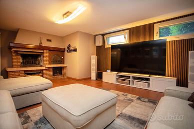 Proponiamo in vendita una raffinata porzione di villa bifamiliare situata a soli 2 km dal centro del paese. L'immobile è circondato da un ampio giardino privato di oltre 4.000mq, impreziosito da una piscina di quasi 100mq con diverse profondità e copertura telescopica, ideale per il relax e il divertimento in ogni stagione. L'abitazione che si sviluppa su tre livelli è in ottimo stato di conservazione ed è stata soggetta ad importanti interventi di restauro. Al piano terra si trova un'ampia veranda riscaldata, adibita anche a zona giorno di 53 mq, caratterizzata da grandi vetrate e soffitti con travi a vista, una zona pranzo, cucina abitabile, disimpegno, bagno di servizio finestrato e una spaziosa lavanderia/locale tecnico. Al piano superiore si sviluppa la zona notte, composta da tre camere da letto, un bagno e una terrazza. Al piano interrato sono presenti una taverna e un ulteriore locale adibito a zona relax o cinema. A pochi passi dalla piscina, nel 2024 è stata realizzata una depandance completamente indipendente dall'abitazione principale, dotata di doppio garage, magazzino, bagno e tettoia/pensilina per impianto fotovoltaico. Completano la proprietà un pratico ricovero attrezzi e un'area giochi per bambini con pavimentazione anti-trauma ed una zona ristoro con barbecue e camino.. Tra gli accessori tecnici di rilievo si segnalano pannelli fotovoltaici da 5 kWh, impianto di riscaldamento con caldaie ad alta efficienza, impianto di domotica, copertura Wi-fi su tutta la proprietà, aria condizionata in ogni stanza, due caminetti interni ed una stufa a pellet, sistemi di allarme volumetrico, perimetrale e videosorveglianza. Inoltre sono stati rifatti l'impianto elettrico ed idraulico ed installati serramenti in PVC antisfondamento nel 2015. Una soluzione unica ed esclusiva, ideale per chi desidera vivere in un contesto elegante, funzionale e immerso nel verde. RIF 65
