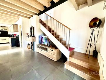 In recente ed elegante contesto residenziale in zona Cinque Strade ad Azzano Decimo, proponiamo porzione di bifamiliare del 2021, caratterizzata da un'elevata indipendenza: le unità sono collegate esclusivamente dai posti auto, rendendo la parte abitativa libera su quattro lati. L'abitazione si sviluppa su due livelli per circa 145 mq complessivi. Al piano terra troviamo un'ampia zona giorno con soggiorno e cucina open space, disimpegno e bagno/lavanderia di comode dimensioni. Il piano primo ospita tre camere da letto ben distribuite, un secondo bagno e un terrazzo a servizio della camera matrimoniale. Il tetto in legno a vista valorizza gli ambienti rendendoli luminosi e ariosi. L'immobile viene venduto arredato di cucina e bagni. All'esterno, porticato coperto ideale per pranzi e momenti di relax, giardino privato di generose dimensioni e doppio posto auto coperto. Soluzione recente, con finiture attuali e in classe energetica A4, garanzia di elevato comfort abitativo e bassi consumi.