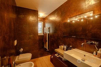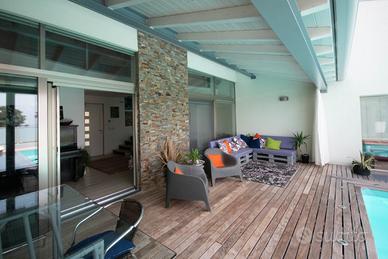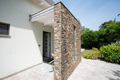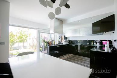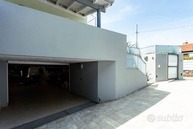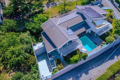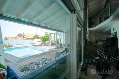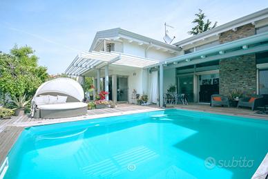 MUGGIA - SAN BARTOLOMEO LUSSUOSA VILLA CON GIARDINO, PATIO E PISCINA DOTATA DI IDROMASSAGGIO. Ingresso, sala da pranzo, salone, cucina, zona lavanderia, camera, bagno e ripostiglio. Piano superiore: camera con cabina guardaroba, ulteriori due stanze con altra cabina armadio, bagno e terrazze. Taverna, zona palestra ed AMPIO BOX AUTO. Riscaldamento a pavimento, vetrate antisfondamento, pannelli fotovoltaici, sistema di irrigazione e condizionamento. STRUTTURA IN BIOEDILIZIA. CLASSE A. Sbalorditivi interni con particolari rifiniture e pavimentazione in legno. VISTA MARE. B.G. Real Estate: tel.