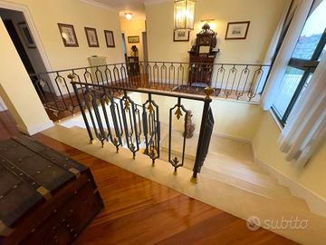 La residenza, costruita nel 2013, si distingue per le sue linee moderne, le ampie vetrate che inondano di luce gli interni e la rilassante vista sul paesaggio circostante, la villa colpisce, anche, per la ricercatezza dei materiali made in Italy che riflettono uno stile di vita esclusivo. L'attenzione ai dettagli è evidente in ogni elemento: il rivestimento dei pavimenti in pietra del Trentino, l'ampia scala che si biforca in due direzioni diventando un'opera d'arte arricchita da balaustre in metallo con decorazioni di ottone fatti su misura, porte in legno intagliate, boiserie arricchite da cornici, elegante camino adornato da mattonelle giustiniane, porta doppia metallica d'ingresso in stile inglese, artigianale, fatta a mano, finiture di pregio e materiali di alta qualità che parlano un linguaggio estetico unico, capace di affascinare chi cerca autenticità e distinzione. Gli spazi interni sono stati progettati per offrire il massimo comfort e funzionalità, distribuiti con equilibrio e razionalità creando un'atmosfera elegante e accogliente dalle simmetrie austere che dialogano con la luce naturale e con l'ampio giardino che circonda la proprietà.