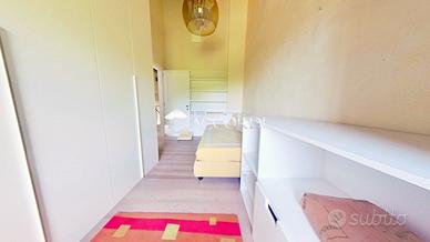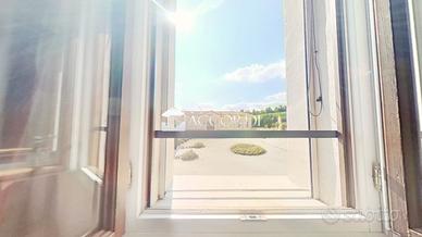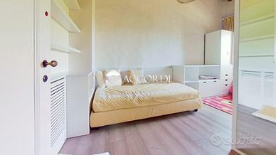 Salendo al piano superiore, un elegante disimpegno introduce due camere singole, un bagno con doccia ed una camera padronale di dimensioni generose, impreziosita da un bagno en suite con vasca idromassaggio, da cui si gode una vista incantevole sul cortile interno e sulla villa storica, con le sue statue che si stagliano sullo sfondo.
