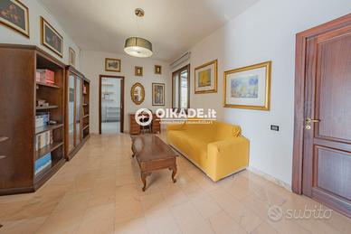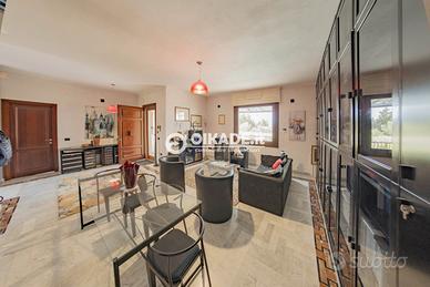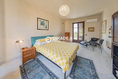 Accediamo alla villa tramite il portoncino principale, ci accoglie un ampio e luminoso soggiorno, la cucina abitabile, due camere da letto, uno studio e due bagni, proseguendo dallo studio accediamo ad un ampio salone che ci permetterà di accedere alla terrazza che affaccia sulla piscina. Troviamo inoltre un ampio bagno e due rampe di scale, una per accedere alla zona notte e l'altra per accedere al piano seminterrato.