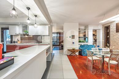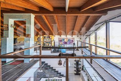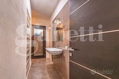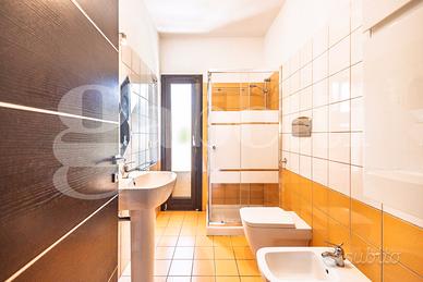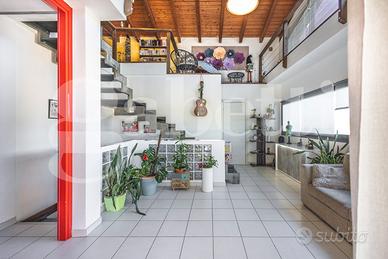Al piano seminterrato ampio locale unico di 80 mq attualmente adibito a zona living con cucina a vista, disimpegno, camera singola, locale tecnico e bagno. Le ampie vetrate permettono di accedere all'ampio cortile con passo carraio.