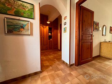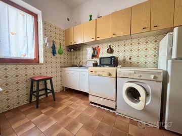 Frontalmente si accede tramite arco all'ampio salone, con uscita sulla corte retrostante, con bordure di aiuole e lavabo esterno. Adiacente all'ingresso, è presente la cucina abitabile, di forma quadrata comodamente vivibile. Il bagno è finestrato, con box doccia.