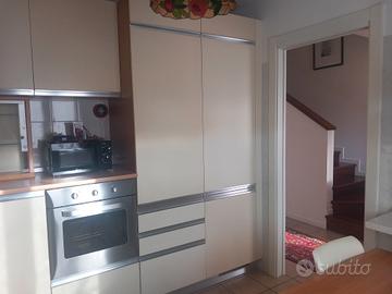 COMPOSIZIONE: Al pianoterra: cucina abitabile, ampio salone soggiorno/salotto con accesso diretto al giardino sul retro,bagno con antibagno/lavanderia in nicchia, elegante accesso alla taverna; al piano superiore camere da letto (matrimoniale, doppia e singola), grande bagno con vasca ed armadio per biancheria bianco (molto comodo), due terrazze (una con tenda da sole); esistente botola d'accesso al sottotetto; taverna: bella grande, asciutta, pulita, riscaldata, anche con elegante caminetto, finestre sulle grandi bocche di lupo, sottoscala chiuso con porta, nicchia chiudibile, pavimenti chiari, altezze interessanti. Accesso pedonale ed accesso carraio motorizzato, con possibilità di lasciare l'auto nel posto pavimentato scoperto, o di metterla in garage. Accesso al garage anche dal giardino sul retro!