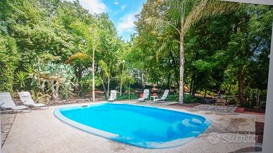 Casa singola ristrutturata con cura in stile siciliano, composta da 7 vani con tre depandance annesse che possono essere utilizzate separatamente o collegate alla casa principale per una dimensione totale di circa 350 mq. La casa è utilizzata in parte come casa di villeggiatura e in parte come casa vacanze e dispone già di CIN ed autorizzazione per 8 posti letto. Della proprietà fa parte anche un ampio parco/boschetto con una piscina di 8 X 4 m molto riservata. Il corpo principale della casa si compone di un salone doppio, 3 ampie stanze da letto di cui due con disimpegni annessi, 3 bagni, una lavanderia ed un'ampia cucina con vetrate sul giardino e stufa a legna. Ogni depandance si compone di una stanza da letto con soggiorno/cucina annesso e bagno e dispone di spazi esterni di pertinenza. La casa ha anche un vano tecnico, una cantina attrezzata come cucina esterna e un garage. Lo spazio esterno prevede anche due posti auto all'aperto. La casa ha un impianto fotovoltaico, impianto solare termico e una vasca dell'acqua per irrigare il terreno della proprietà.